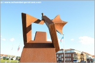 Der Mann im Sturm hat an diesem Tag nicht viel auszuhalten. Übrigens wurde diese 3,50 Meter hohe Skulptur 2004 durch den Kunstschmied Heiko Voss anlässlich einer Kunstausstellung in Schönberg angefertigt und seitdem als Leihgabe an der Seebrücke am Schönberger Strand aufgestellt.