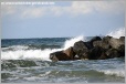 Baden ist leider nur eingeschränkt möglich und lt. DLRG gibt es eine Badezonenbegrenzung außerdem dürfen Wassersportgeräte nicht verwendet werden. Das Baden in der Brandung macht den Sommergästen natürlich riesigen Spaß. Bei diesem starken Wind lohnt sich einmal ein Blick auf die „Naturseite“ der Ostsee...und nun bekommt man auch eine kleine Vorstellung von der Nützlichkeit der Buhnen, die den Sand dort belassen, wo er hingehört damit er nicht Richtung Heidkate abwandert. Für die Möwen, die aufgrund des Windes ein Flugverbot erlassen haben, sind die Buhnen ein willkommener Rastplatz bis zum Nachlassen des Windes. Ein Panorama-Foto der Möwen auf der Buhne.