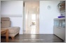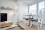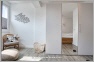Eine lichtdurchflutete Nische, ideal für die morgendliche Tasse Kaffee oder ein gutes Buch: Zwei gemütliche Rattan-Sessel mit Kissen, ein gestrickter Pouf und ein kleiner Beistelltisch. Große Fenster mit Plisseessorgen für ideale Lichtverhältnisse.