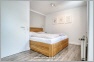 Ein Doppelbett mit stilvoller Kopflehne bietet eine komfortable Liegefläche. Das Bettgestell verfügt über praktische Schubladen für zusätzlichen Stauraum. Ein großzügiger Kleiderschrank bietet viel Platz. Eine große Spiegelfläche an einer Schranktür vergrößert den Raum optisch.