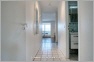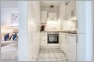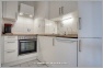 Küchenzeile: Die separate, aber offen gestaltete Küchenzeile ist mit hellen, weißen Einbauschränken und einem Fliesenspiegel mit blauen Akzenten ausgestattet. Sie ist für die Zubereitung der Mahlzeiten bestens geeignet.