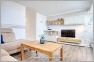 Eine große, beigefarbene Eckcouch mit hoher Rückenlehne lädt zum Entspannen ein. Ein quadratischer Couchtisch aus hellem Holz steht dort zentral. Eine moderne, weiße Wohnwand mit Holz-Akzenten und integrierten Glasvitrinen präsentiert maritime Dekorationen. Ein Flachbildfernseher ist vorhanden. Der Zugang zum Internet erfolgt kostenlos per Wlan.