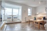 Essbereich: Ein leicht erhöhter Bereich beherbergt den Esstisch. Dazu stehen vier Holzstühle bereit – mit direktem Blick auf die Ostsee und die Seebrücke.