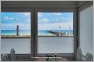 Genießen Sie den atemberaubenden Ausblick direkt auf die historische Seebrücke von Schönberg. Der Blick reicht weit über das türkisblaue Wasser und die Promenade. Strandleben vor der Tür: Vom Fenster aus beobachten Sie das lebendige Strandgeschehen, inklusive der klassischen Strandkörbe, der vorgelagerten Grünfläche/Deichpromenade und der Ostsee mit ihren Bojen und Schiffen. Die weißen Plissee-Vorhänge ermöglichen dabei eine flexible Regulierung des Blicks und der Privatsphäre.