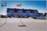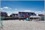 Die Ferienwohnung liegt in einem charakteristischen Gebäude mit blauen Erkern und einem roten Ziegeldach in unmittelbarer Nähe zum Strand. Geschäfte und Restaurants befinden sich unten im Haus. Eine rote Pfeilmarkierung auf den Außenfotos zeigt die genaue Lage Ihrer Wohnung im Komplex an.