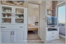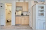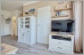 Im Wohnraum befindet sich eine kleine Küchenzeile, in der Sie Ober-und Unterschränke für Stauraum vorfinden. Eine praktische Mikrowelle, sowie eine Kaffemaschine stehen zur Verfügung. Die vorhandenen Herdplatten (Ceran) und diverse Küchenutensilien laden zum Kochen ein. Der Wohnraum ist in warmen und gemütlichen Farben eingerichtet. Ein breites Sofa und ein Sessel stehen vor der großen Fensterfront Richtung Terrasse. Sie finden ebenfalls einen großen Esstisch mit Stühlen, sowie diverse Regale und eine Kommode vor. Auf dem Fernsehtisch steht ein moderner Flachbild TV bereit. Über knapp eine komplette Wandseite zieht sich ein breiter Einbauschrank, der viel Platz für das mitgebrachte Reisegepäck bietet. Der Zugang zum Internet erfolgt über WLan.