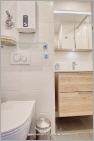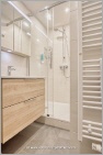 Das separate Schlafzimmer wird mit Tageslicht durchflutet und beinhaltet ein Doppelbett. Ein Nachtisch und zwei Leselampen sorgen für mehr Komfort. Das schlichte Badezimmer ist mit einer Dusche und einem hochwertigen Waschtisch ausgestattet. Darunter befindet sich Platz für Ihre Badezimmerutensilien. Auf der Terrasse befindet sich ein weiterer Esstisch mit Stühlen, um im Sommer draußen zu Frühstücken oder zu Grillen. Für noch mehr Urlaubsgefühl steht auf der Terrasse ein gemütlicher und moderner Strandkorb für Sie bereit. An sonnigen Tagen können Sie die Sitzfläche erweitern und auf eine leichte Liegeposition vergrößern. Vor dem Terrassenbereich befindet sich ein kleiner Rasenbereich. Für mehr Privatsphäre und als Windschutz wurden Seitenwände zur Terrassenabtrennung aus Holz aufgestellt. Der Pkw kann kostenlos in der verschlossenen Tiefgarage des Hauses (Durchfahrtshöhe beachten) abgestellt werden. Mitgebrachte Fahrräder finden dort außerdem Platz. Eine Waschmaschine und ein Trockner können im Gemeinschaftsbereich gegen eine Gebühr genutzt werden.