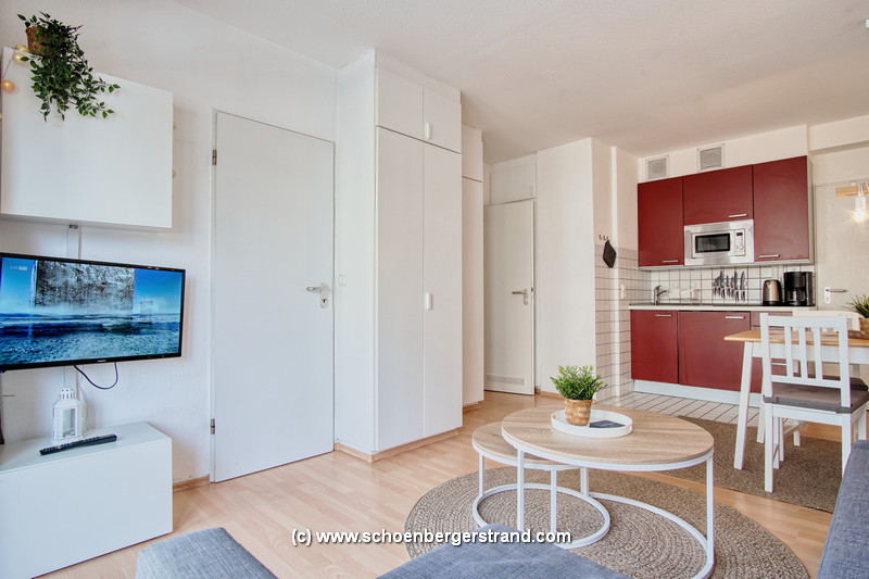 Das gemütliche Appartment bietet auf ca. 31 Quadratmeter Wohnfläche alles, was Sie für einen erholsamen Aufenthalt am Schönberger Strand benötigen. Der Wohnbereich ist mit einem modernen Fernseher ausgestattet, perfekt für entspannte Abende. Der Zugang zum Internet erfolgt kostenlos über WLan. Praktische Schränke sorgen in der Ferienwohnung für ausreichend Stauraum für das mitgebrachte Reisegepäck. Das bequeme Ecksofa lädt zum Entspannen ein, und der helle Essbereich bietet vier Plätze für gesellige Runden. Die voll ausgestattete Küche in lebhaftem Rot hat alles, was Sie zum Kochen benötigen. Hier können Sie mühelos Ihre Mahlzeiten zubereiten. Diese können im angrenzenden Essbereich mit 4 Plätzen eingenommen werden. Im separaten Schlafzimmer sorgt ein Doppelbett für die erholsame Nachtruhe.
