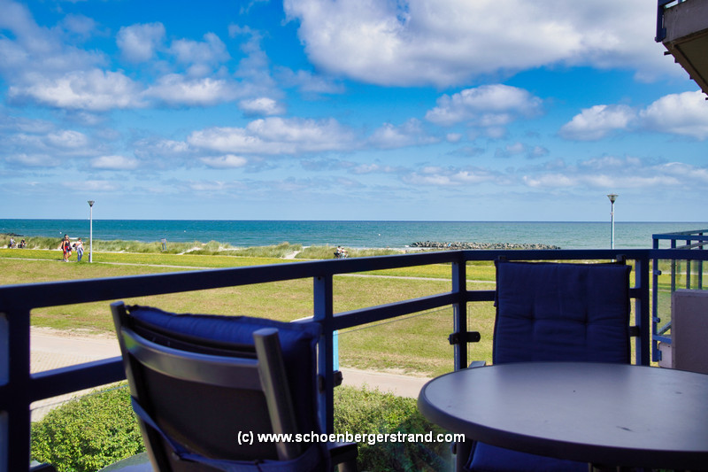 Der Wohnbereich bietet Zugang zum Balkon mit Meerblick. Auch aus dem Wohnraum selbst ist die Ostsee sichtbar. Zusätzlich besteht vom Schlafzimmer aus Meerblick aus dem Fenster. Der Balkon bietet Platz zum Verweilen und ermöglicht einen freien Blick über den Strand und das Wasser. Im Wohnraum steht eine Schlafmöglichkeit (Schlafsofa) zur Verfügung, sodass neben dem separaten Schlafzimmer zusätzliche Übernachtungsmöglichkeiten gegeben sind.
