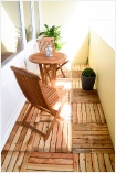 Der Wohn-Schlafraum wurde mit dunklem, hochwertigem Laminat ausgelegt. Darin befinden sich u.a. ein großes Doppelbett (180x200) und ein geräumiger Kleiderschrank mit 4 Türen, der bis unter die Decke reicht. Somit steht viel Platz für das mitgebrachte Reisegepäck zur Verfügung. Ein großer Flachbild Fernseher und eine Stereoanlage sorgen für die elektronische Unterhaltung. Die Küche ist modern und verfügt neben einer Einbau-Mikrowelle und einem 2-Platten Ceranfeld über ausreichend Geschirr. Die zubereiteten Mahlzeiten können am Esstisch für 2 Personen eingenommen werden. Das gepflegte Badezimmer verfügt über eine Dusche und WC. Auf dem großen überdachten Balkon stehen Balkonmöbel bereit.