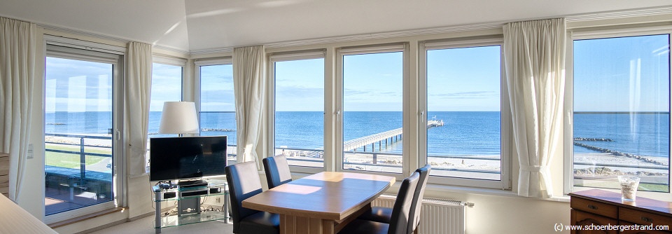 Das Wohnzimmer ist u.a. mit einem Sofa und einem Esstisch mit 4 Plätzen eingerichtet. Im ganzen Raum bietet sich ein Panoramameerblick über die gesamte Breite der Fensterfront. Bei der Einnahme der Mahlzeiten sehen Sie vom Esstisch direkt auf die Schönberger Seebrücke. Für die technische Unterhaltung gibt es im Wohnzimmer einen 2. Fernseher. Der Zugang zum Internet (Glasfaser) erfolgt kostenlos per WLAN. Über eine Balkontür (linke Raumseite) geht es auf den ca. 13 Meter langen (Eck) Balkon. Von hier geht der Blick über die Kieler Bucht und die Seebrücke bis zur Hohwachter Bucht. Ein Tisch sowie eine kleine Sitzbank und Balkonstühle stehen dort bereit. Ein zweiter Zugang zu einem weiteren kleinen Balkon befindet sich auf der rechten Seite des Raums.